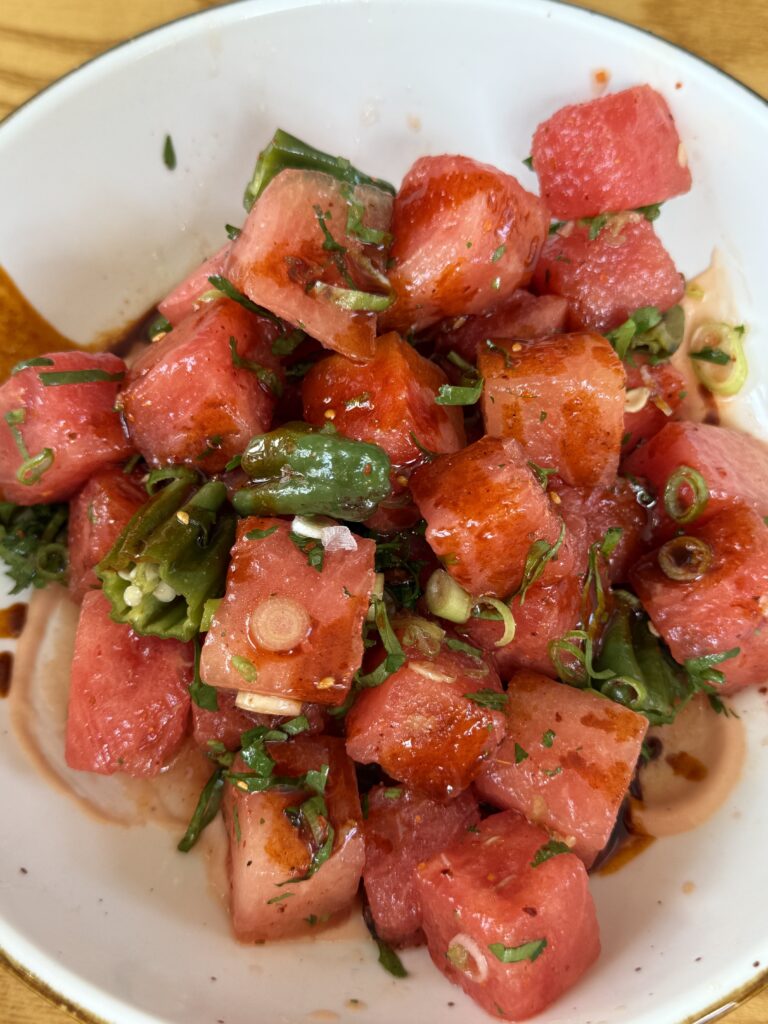 But the thing that will live rent-free in your brain long after brunch is the watermelon salad. This isn’t your standard fruit-and-feta situation. It comes dressed with chilies, sesame oil, and scallions, and it’s spicy, smoky, and refreshing all at once. It’s the dish we’ll be talking about for weeks.